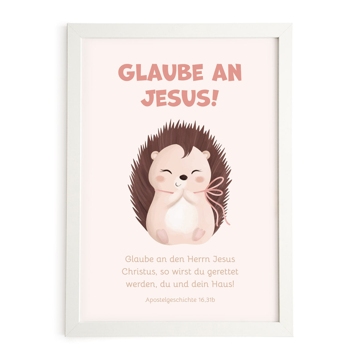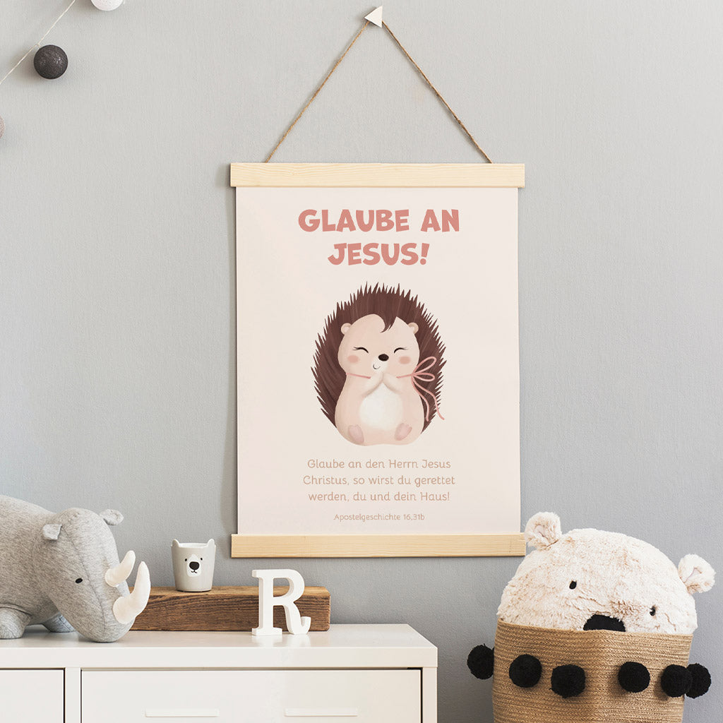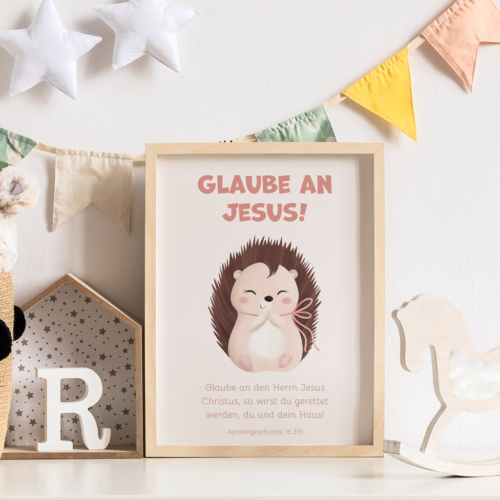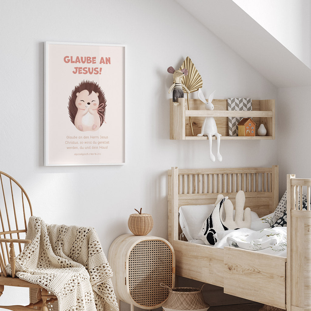 Schenk dem Kinderzimmer eine hoffnungsvolle und friedliche Atmosphäre mit unserem wundervollen Poster "Glaube an Jesus!" Dieses liebevoll gestaltete Wandbild zeigt eine zarte und betende Igel-Illustration, die Sanftmut und reinen Glauben symbolisiert. Dazu kommt der zentrale Bibelvers aus Apostelgeschichte 16,31b: "Glaube an den Herrn Jesus Christus, so wirst du gerettet werden, du und dein Haus!"