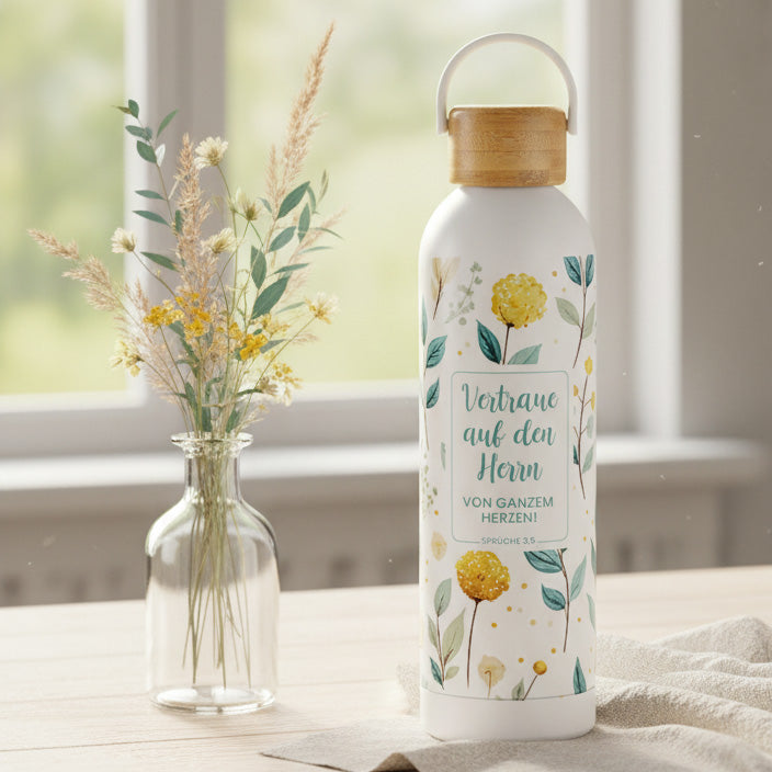 Die isolierte Trinkflasche "Vertraue auf den Herrn" ist mehr als nur ein praktisches Accessoire. Sie ist eine tägliche, geistliche Stütze, die dich durch das Vertrauen auf die Zusage in Sprüche 3,5 ermutigt und dir mit dem floralen Design Freude schenkt.